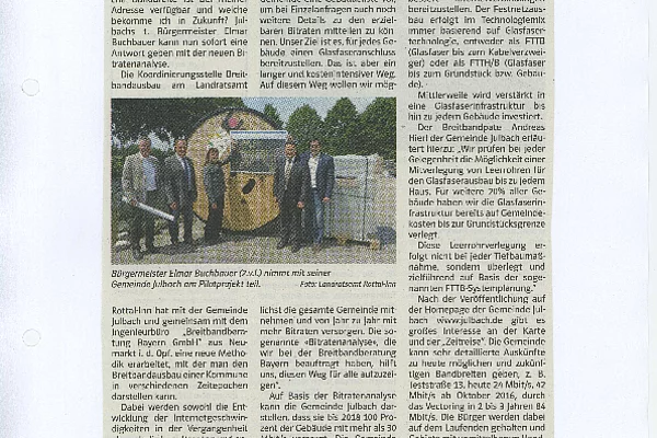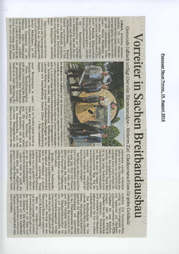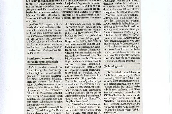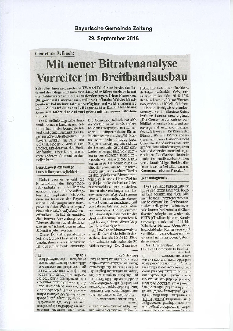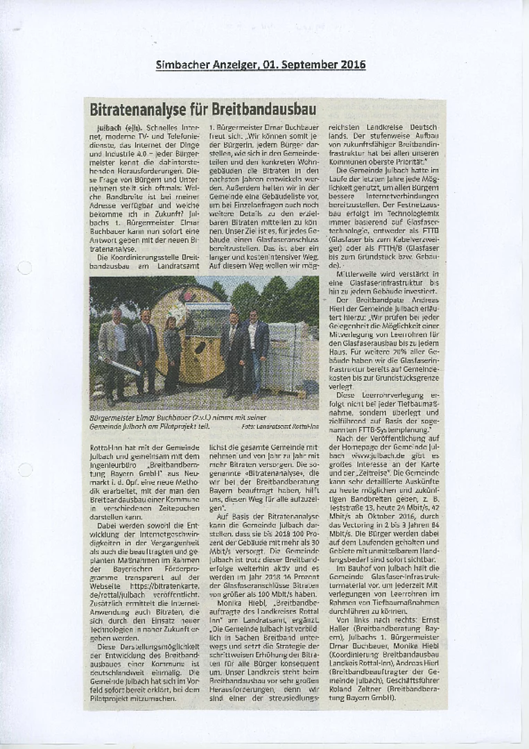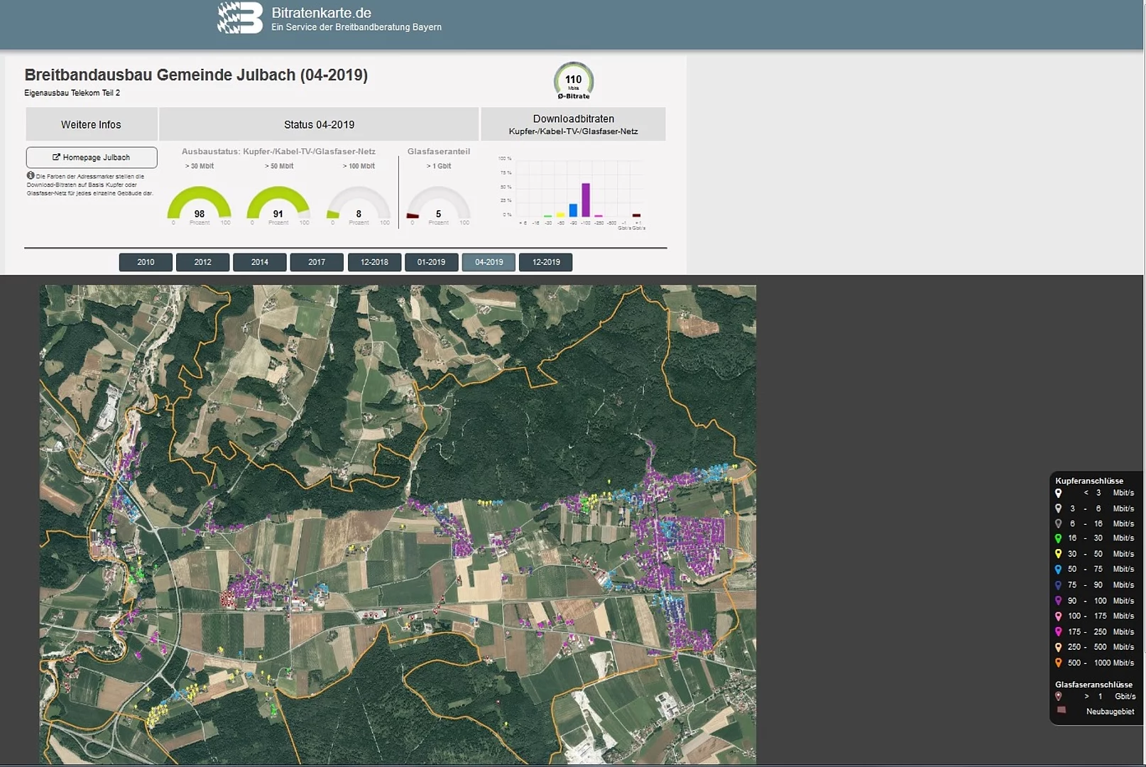 Anfang 2016 erstellte die Breitbandberatung Bayern für die Gemeinde Julbach eine sog. Bitratenanalyse. Diese erlaubt es, die Entwicklung des Breitbandausbaus, für jedes Anwesen, in der Vergangenheit, Gegenwart und Zukunft darzustellen.